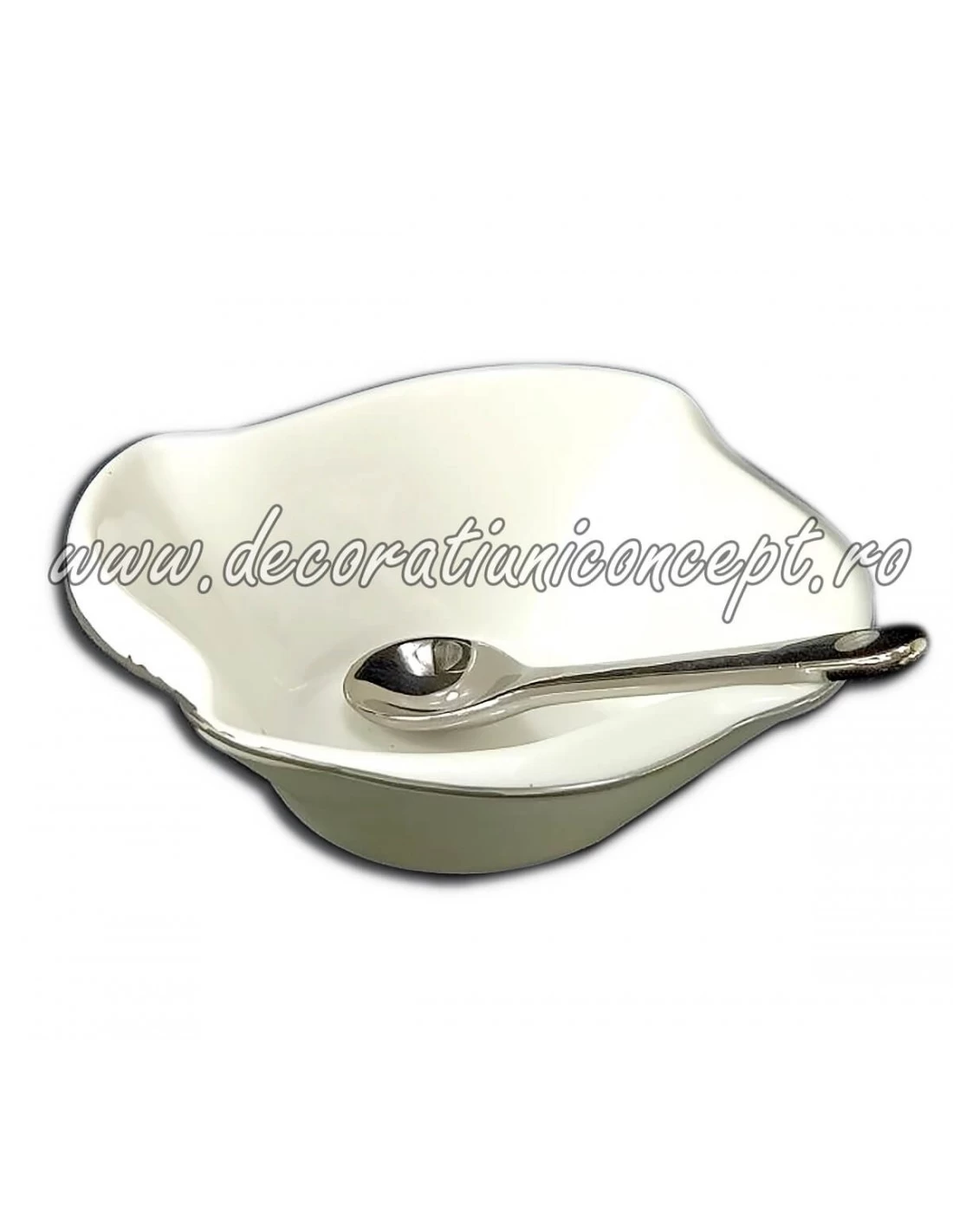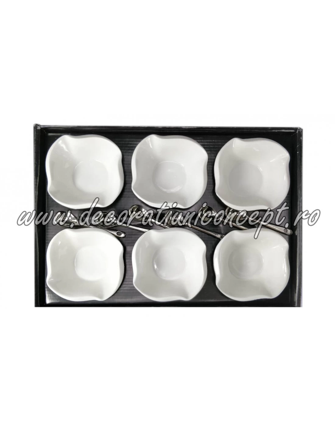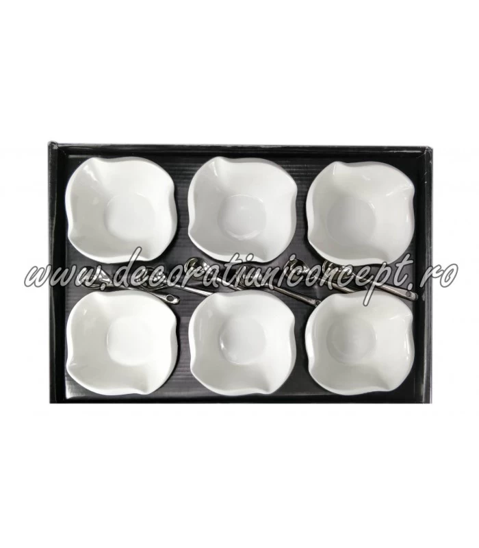 Set 6 boluri ceramice, de culoare alba, cu margine argintie si 6 lingurite din ceramica. Pot fi folosite in nenumarate feluri, de exemplu pentru a servi aperitive, sosuri, bomboane, toppinguri, inghetata etc.