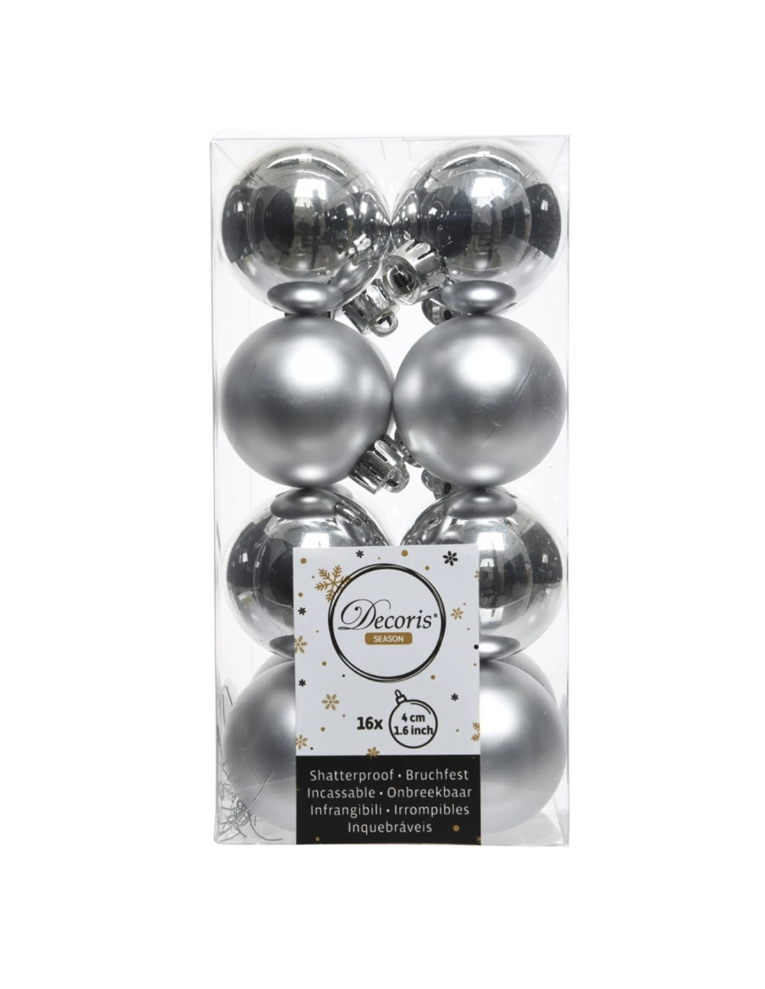 Set 16 globuri Decoris shatterproof asortate silver, 2 modele:mat, shiny cu diametrul de 4 cm, realizate din material plastic shatterproof.