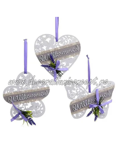 Set de 3 decoratiuni din lemn, in forma de floare, fluture si inima, decupate. Acestea prezinta o banda textila cu marginea dantelata. Decoratiunile sunt completate de 2 figurine in forma de flori de lavanda cu fundita de culoare asortata.