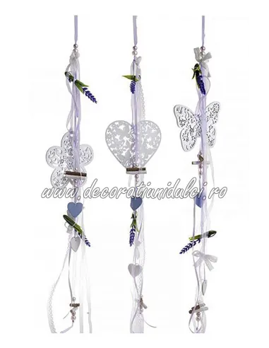 Un set de 3 decoratiuni tip sirag cu un element decorativ central din lemn decupat (floare, inima, fluture) si cu elemente secundare (inimioare din lemn plin, figurine flori de lavanda, perlute, snur decorativ). Foloseste-le sa dai un aer de sarbatoare casei tale sau oricarei sali de festivitati.