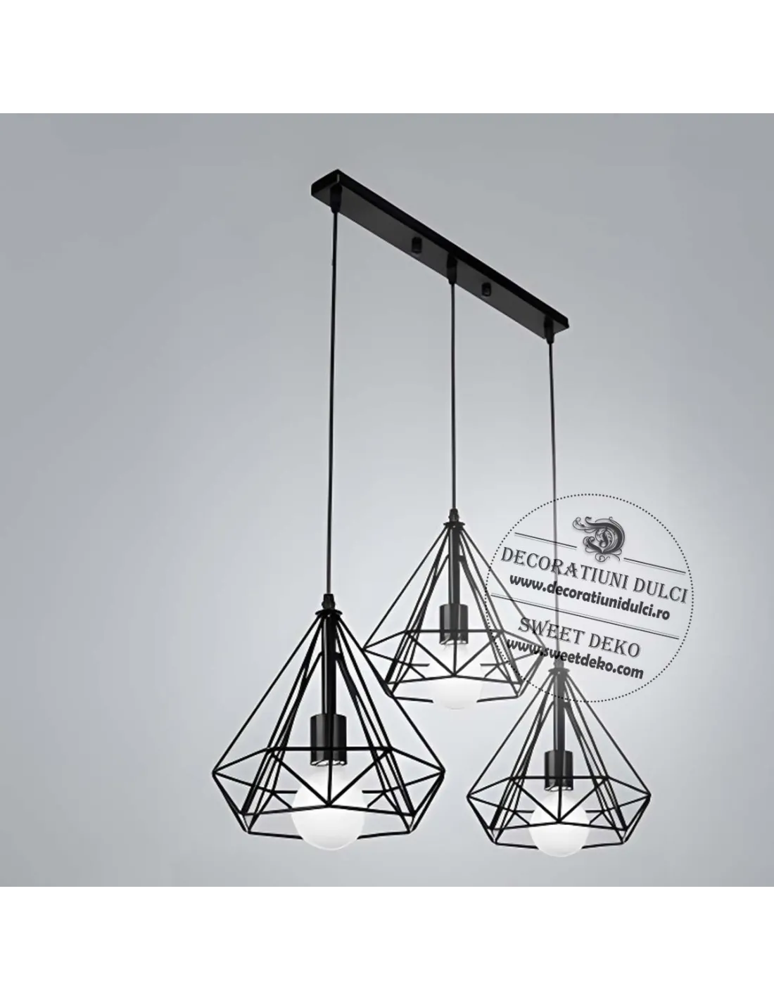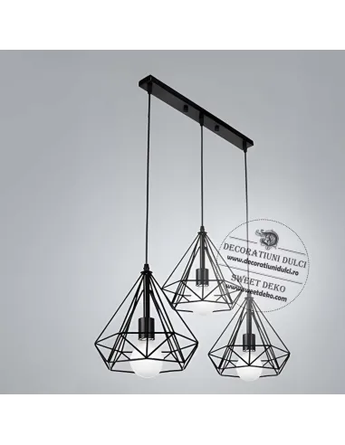 Lustra moderna cu trei pendule din metal negru, cu design geometric, ideala pentru living, dining sau bucatarie.