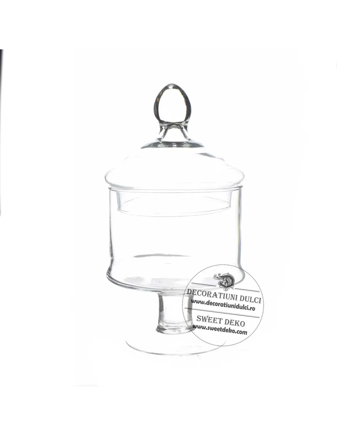 Bomboniera din sticlan cu picior si capac, pentru diferite desrturi si aranjamente.