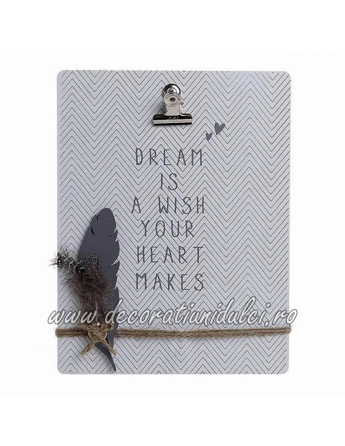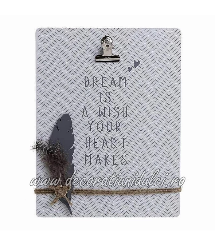 Panou de lemn decorativ ce poate fi montat pe perete. Prezinta un clips cu ajutorul caruia se pot fixa mesaje, hartii, meniu etc. Are un aspect rustic, cu decoratiuni in forma de pana prinse cu un nasture pe sfoara. Textul imprimat pe panou este : "DREAM IS A WISH YOUR HEART MAKES" sau in traducere "Visele sunt dorintele inimii!" un mod ideal de ati incepe ziua cu o astfel de motivare.